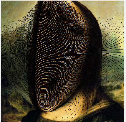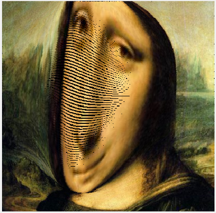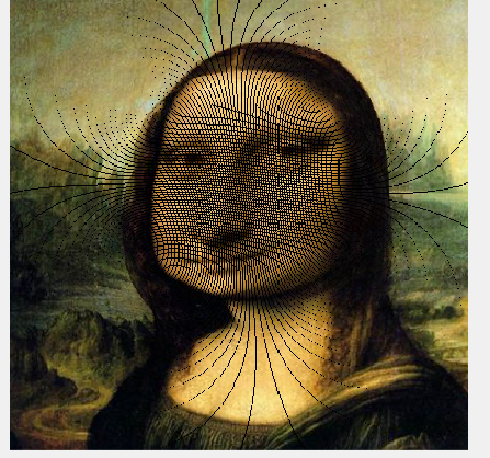 是以对预期变换后图像的每个像素点位置找到它对应的原位置,那么此时方程变为 \(\begin{aligned} R_i(\mathbf{x})&=\frac{1}{|\mathbf{x-q_i}|^2+d_i}\\ \boldsymbol R \boldsymbol\alpha&=\mathbf p-\mathbf q\\ \pmb{f}(\pmb{x})&=\sum _ {i=1}^n \boldsymbol{\alpha} _ i R_i(\mathbf{x})+\pmb{x} \end{aligned}\tag8\) 此时要做的是计算出每个像素点 $\mathbf{x}=(i,j)$ 对应的原位置 $\mathbf {f(x)}$,此时变换后新图像每点的像素值为 $\mathbf{f(x)}$ 处的像素值。