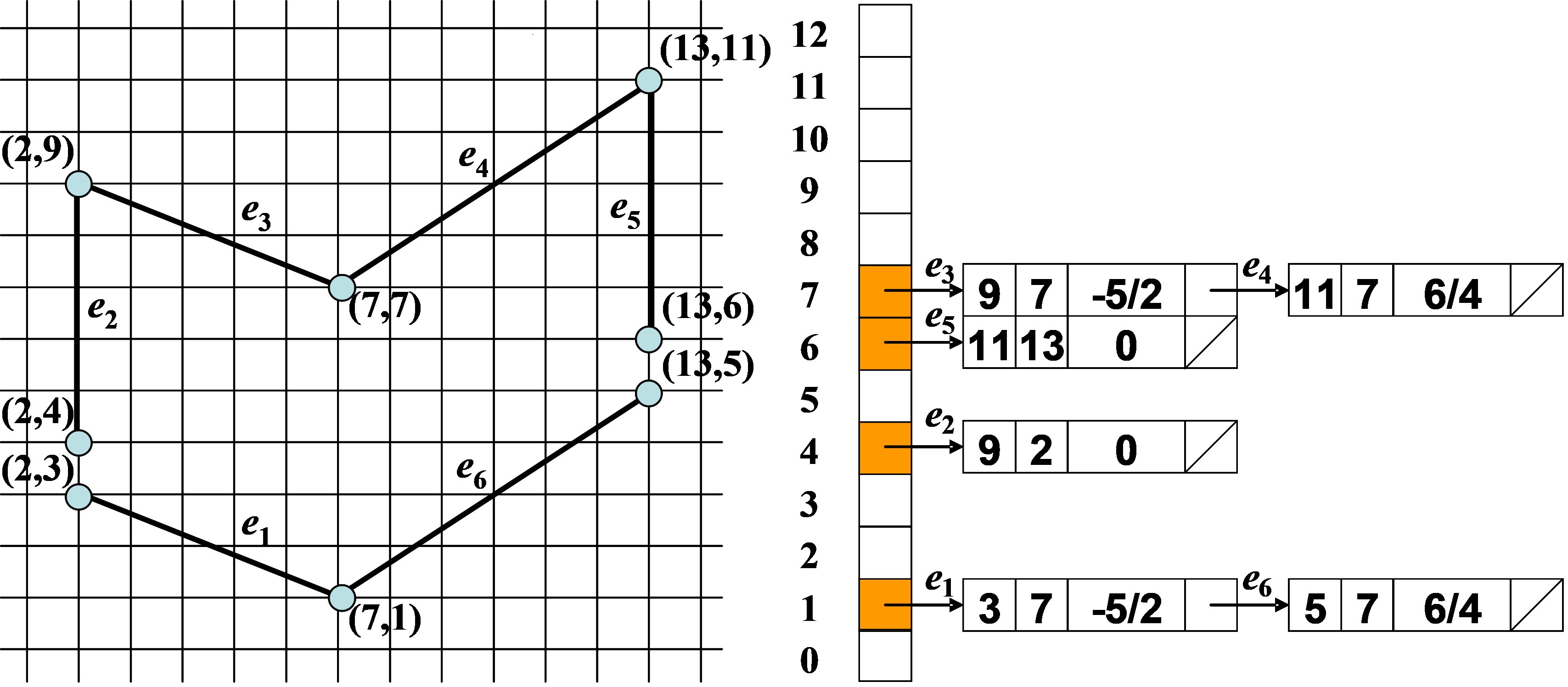 (1) Before filling a polygon, it is necessary to first create an edge table to store information about the polygon’s edges. The edge table is a type of adjacency list. The entries in the edge table (ET) are sorted in increasing order of their y-coordinates, and the “bucket” under each entry is sorted in increasing order of their x-coordinates. The content of each item in the “bucket” is: