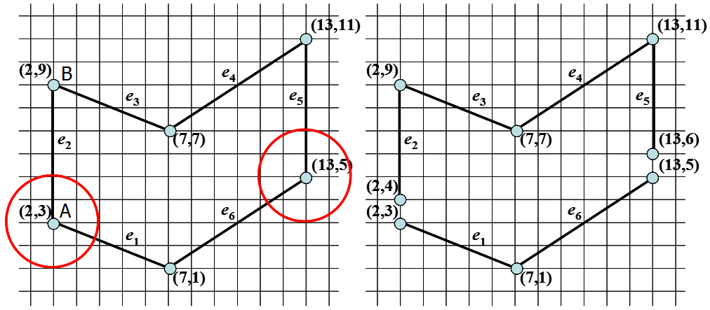 The reason is as follows: For example, in the figure below, for point B, no extra processing is needed because when the scanline is at y=9, both e2 and e3 will be included in the AET. That is, point B will appear twice in the current AET, and when filling, it will enter and exit at that point, avoiding any filling errors. However, for point A, if it is not moved inward, when the scanline is at y=3, both e1 and e2 will be included in the AET. Therefore, point A will also appear twice in the current AET, resulting in three points in the AET and causing an error in the filling of the polygon interior after the row y=3. In addition, the AET should always contain an even number of points. After moving inward, point A will only appear once in the current AET, and there will be an even number of points, resulting in correct filling.