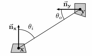 \[G(\pmb{x}\leftrightarrow\pmb{y})=V(\pmb{x}\leftrightarrow\pmb{y})\frac{|\cos\theta _ {\pmb{x},\pmb{y}}||\cos\theta _ {\pmb{y},\pmb{x}}|}{\|\pmb{x}-\pmb{y}\|^2}\]Where, $V(\pmb{x}\leftrightarrow\pmb{y})$ is a visibility function, which is 1 if there is no occlusion between $\pmb{x}$ and $\pmb{y}$, and 0 otherwise. $G$ is a symmetric function, meaning that $G(\pmb{x}\leftrightarrow\pmb{y})=G(\pmb{y}\leftrightarrow\pmb{x})$.