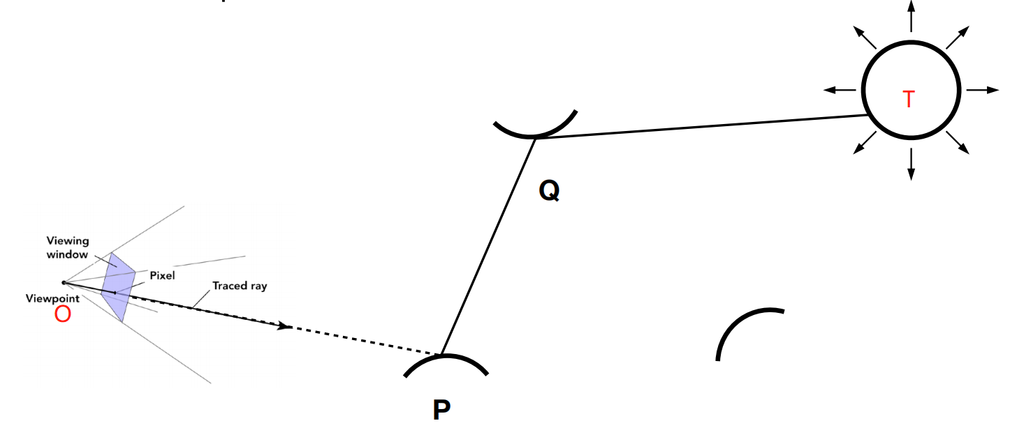 Assume that the camera is located at point O and the light source is at point T. We want to calculate the radiance of point P projected onto point O. We perform Path Tracing along the OPQ path: